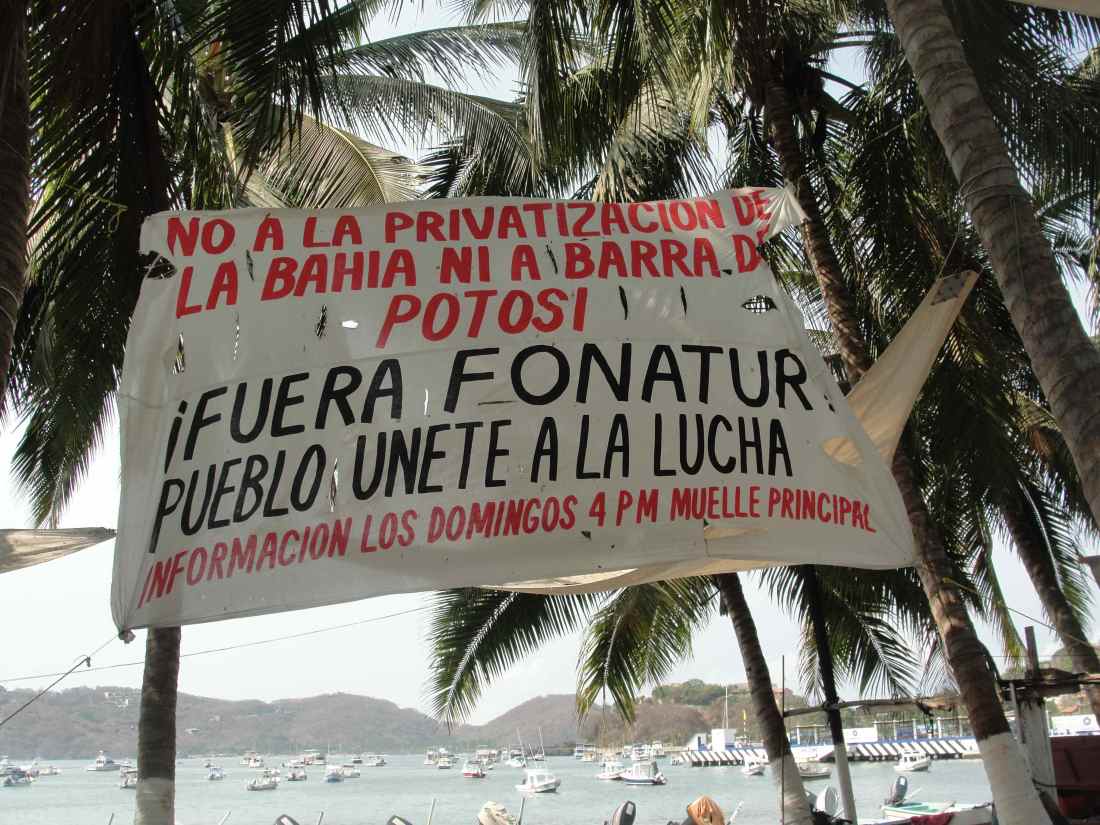 But it is home to a way of life of thousands of working people who, fish, run small businesses, provide services and work in other areas from construction to mining. On the first Sunday of my visit, I went down to the village waterfront–the Bahia. As I watched the fish market transpire, with fishers selling their fresh catch to everyone from men and women shopping for their families to restaurant cooks looking for their menu’s daily catch, my eye was drawn to a big sign that read “Stop the privatization of the Bahia and the Barra de Potosi.” The latter is a small community south of Zihua. I started asking questions of the fishers and some locals.